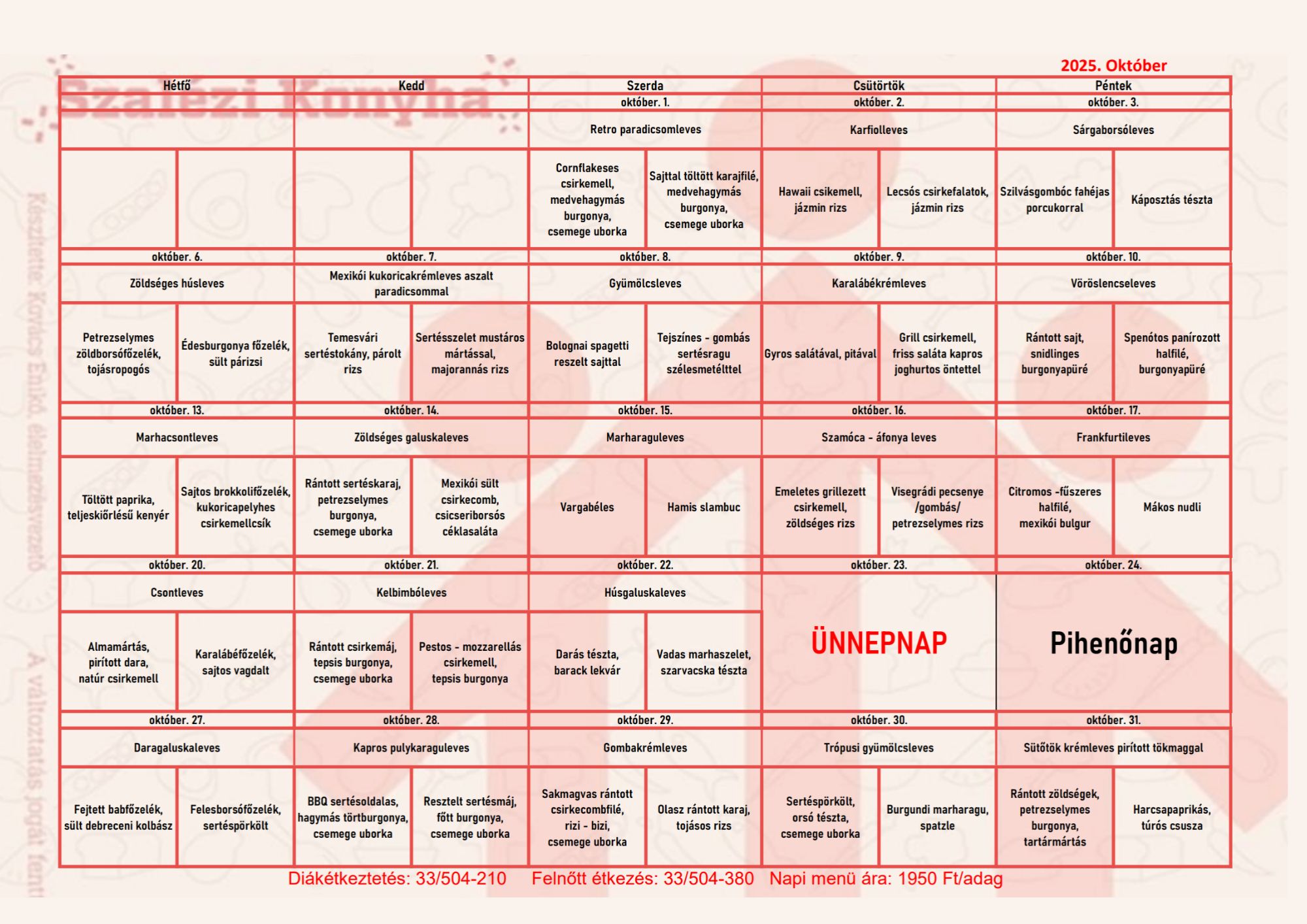 OKTÓBERI AJÁNLAT (diákoknak, illetve elvitelre a nyergesújfalui konyháról):